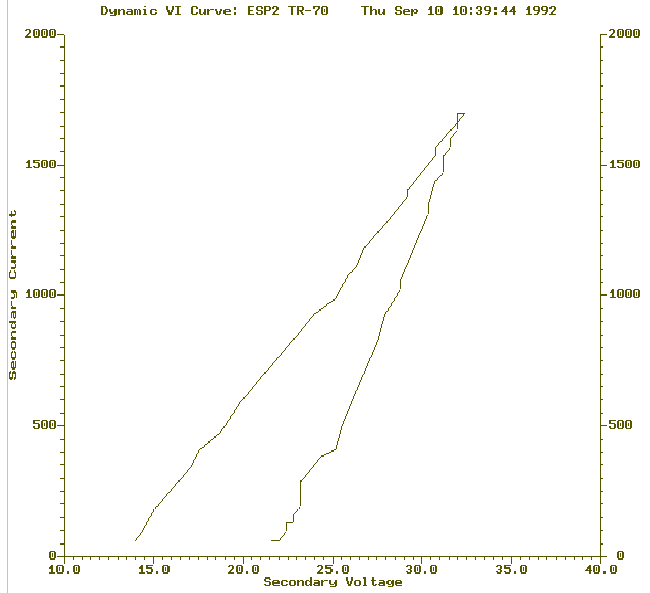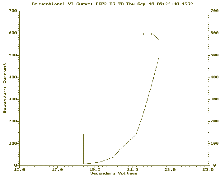 Why Dynamic VI CurvesWhenever the ESP is not operating properly the first question asked, is, have you run a Voltage Current curve or VI curve? The object being verification of a back corona condition. Briefly, back corona causes the electrical section to collect less ash as the secondary currents increase. The secondary voltage will actually decrease at higher power levels. Conventional test for back corona is to manually or automatically reduce the output of the control to secondary current threshold. From this point recordings are taken approximately every 10 ma to 50 ma steps. The recordings are plotted and signs of a secondary voltage fold back are studied. Obviously this test requires reduction in the operating level of the control, some period of time and the disturbance of the operating dust layer.